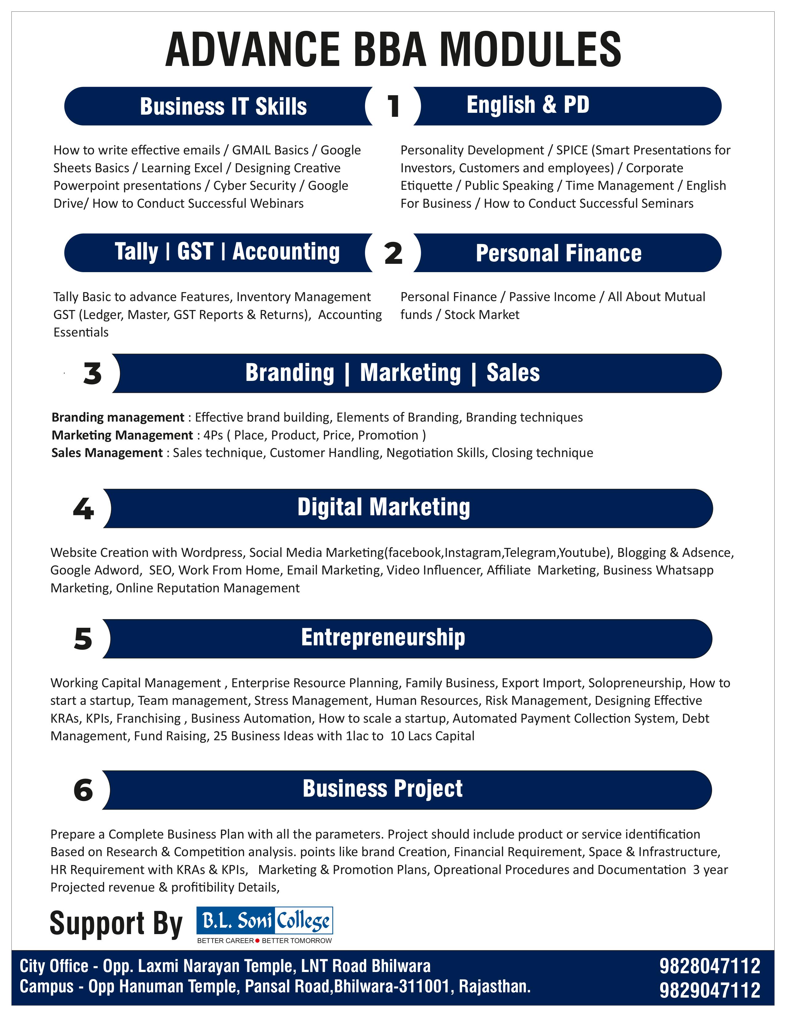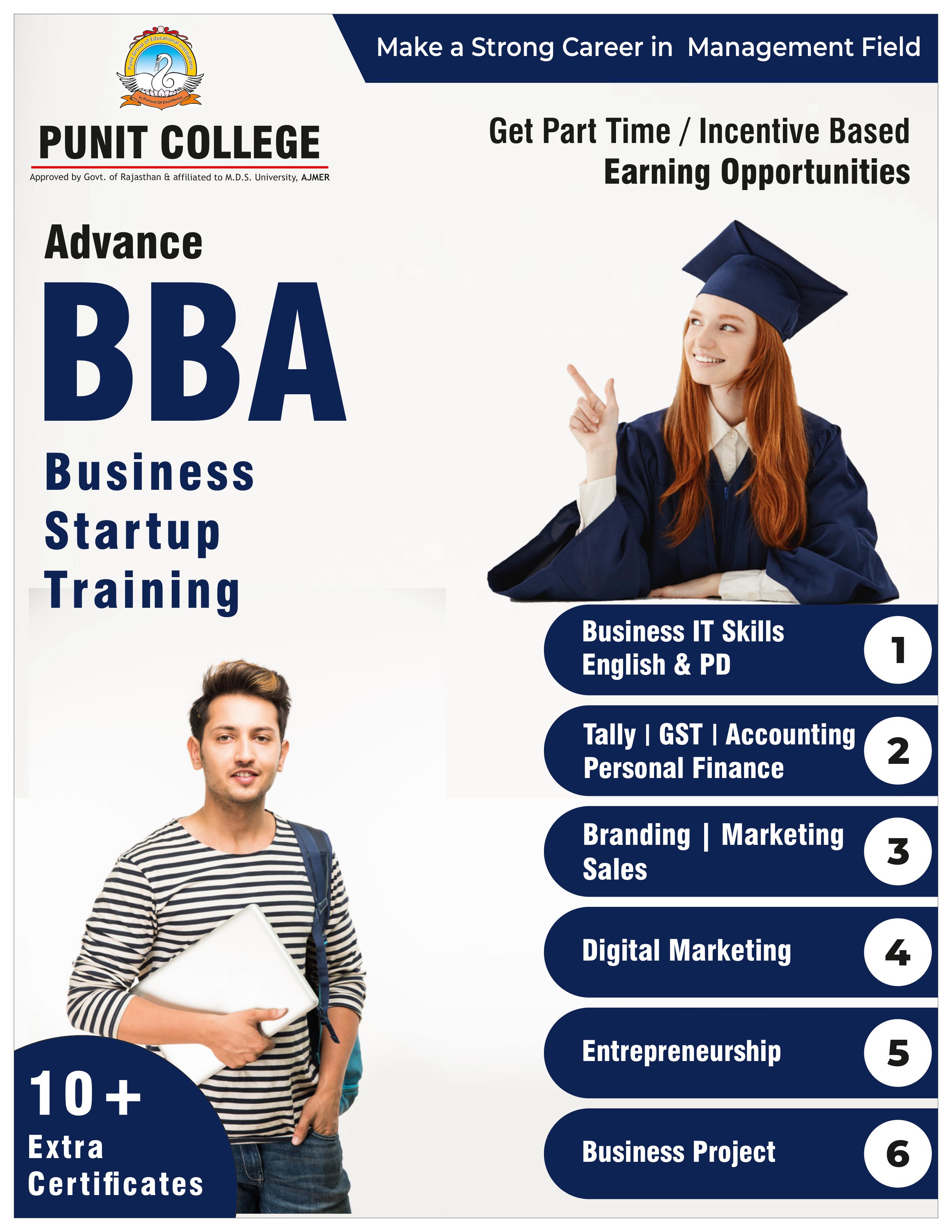 BBA – The Bachelor's Degree Program is a three-year degree course, affiliated with MDS University Ajmer, which lays more emphasis on practical exposure to the participants. The broad nature of the course equips students for a wide variety of careers in both public and private sectors related to management and software applications. Punit College focuses on:-
