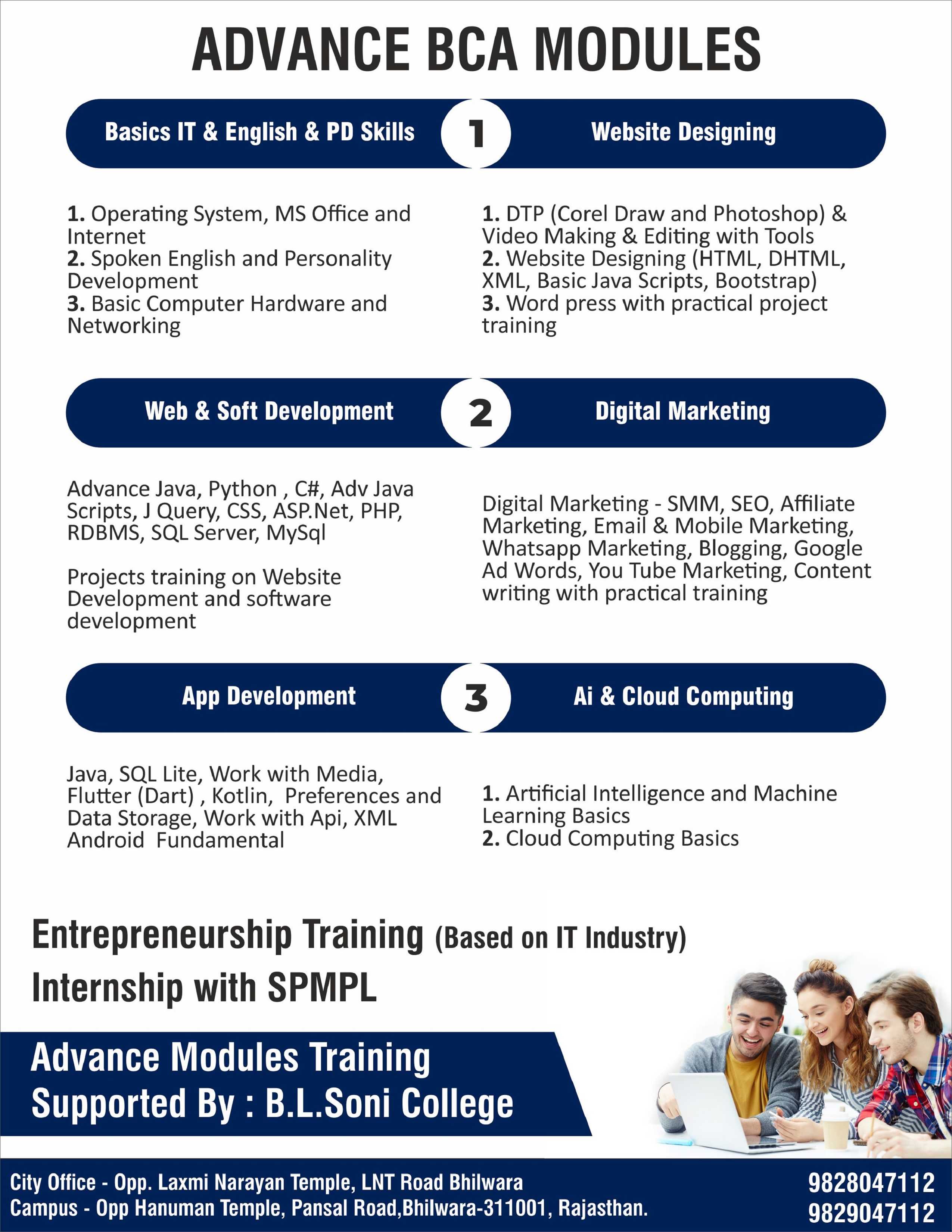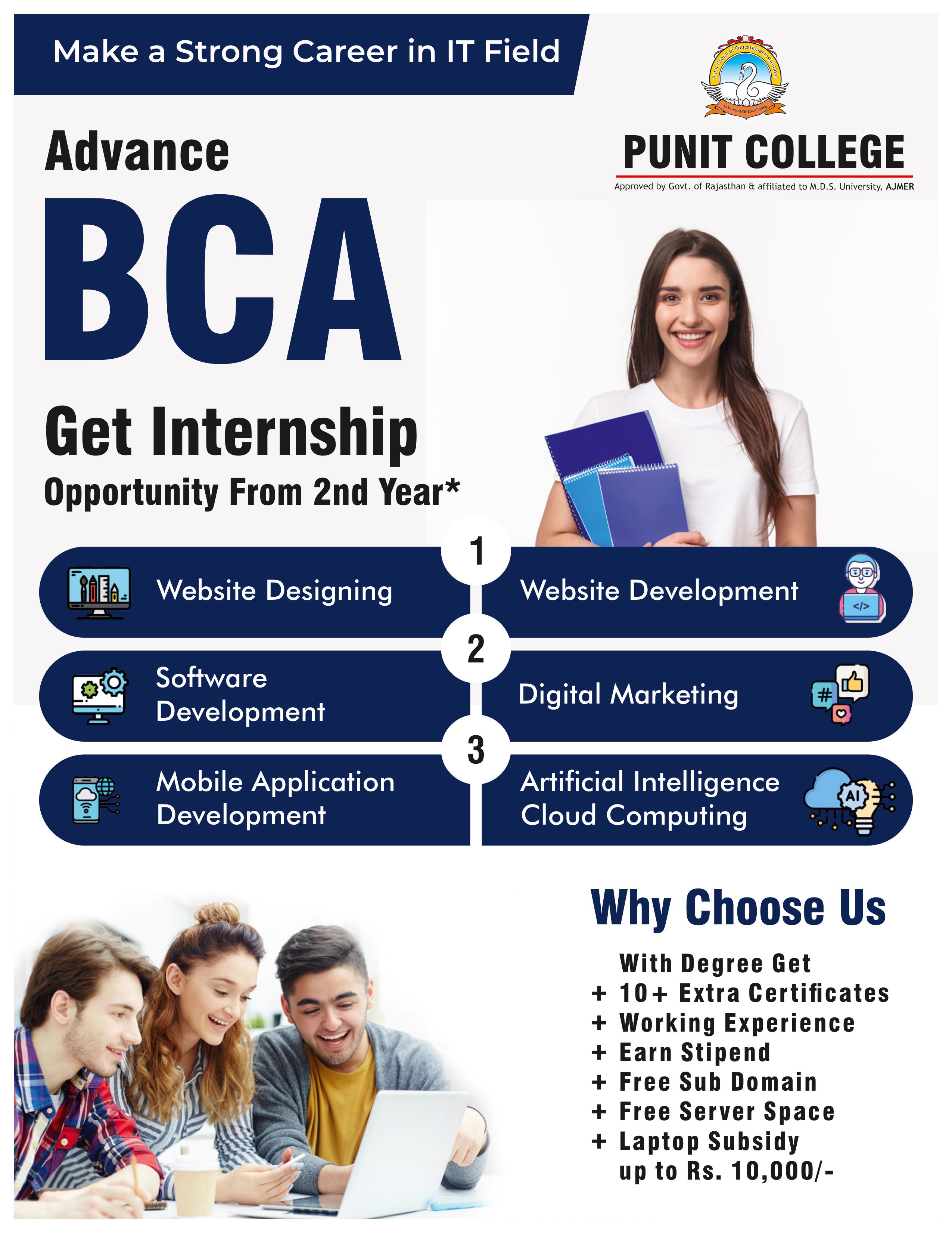 BCA – The Bachelor's Degree Program is a three-year degree course, affiliated with MDS University Ajmer, which lays more emphasis on practical exposure to the participants. The broad nature of the course equips students for a wide variety of careers in both public and private sectors related to management and software applications. Punit College focuses on:-
