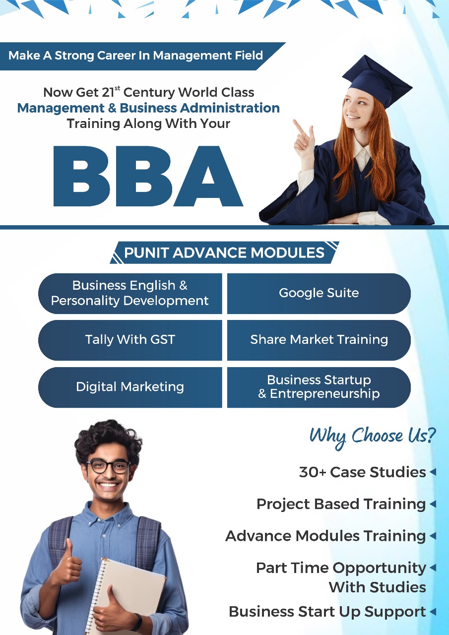 BBA – The Bachelor's Degree Program is a three-year degree course, affiliated with MDS University Ajmer, which lays more emphasis on practical exposure to the participants. The broad nature of the course equips students for a wide variety of careers in both public and private sectors related to management and software applications. Punit College focuses on:-