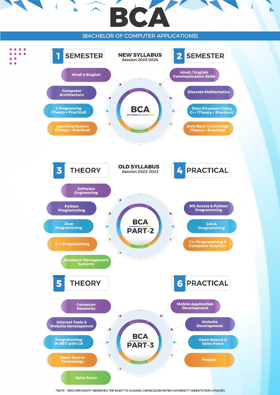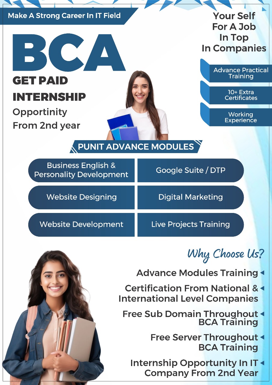 BCA – The Bachelor's Degree Program is a three-year degree course, affiliated with MDS University Ajmer, which lays more emphasis on practical exposure to the participants. The broad nature of the course equips students for a wide variety of careers in both public and private sectors related to management and software applications. Punit College focuses on:-
